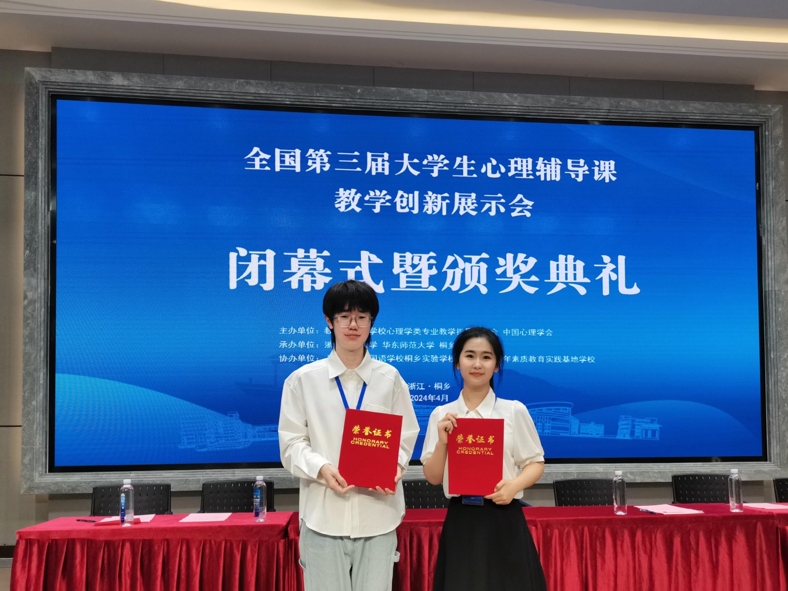 4月25日-26日,全国第三届大学生心理辅导课教学创新展示会在浙江桐乡举办。澳门永利集团 心理学专业2020级叶晓慈和2021级沈乃榕分别荣获特等奖和一等奖,指导教师为心理系赵献梓和魏曙光。